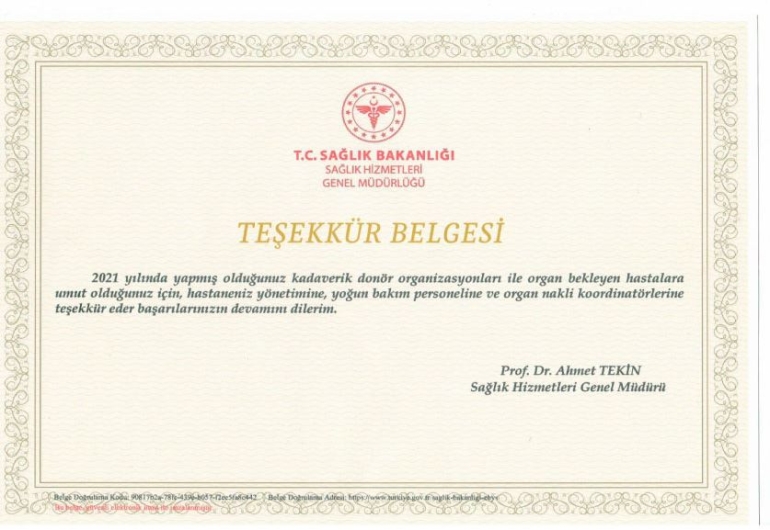 Sağlık Hizmetleri Genel Müdürü Prof. Dr. Ahmet Tekin adına takdim edilen belgede, “2021 yılında yapmış olduğunuz kadaverik donör organizasyonları ile organ nakli bekleyen hastalara umut olduğunuz için hastaneniz yönetimine, yoğun bakım personeline ve organ nakli koordinatörlerine teşekkür ederek, başarılarınızın devamını dilerim” ifadeleri yer aldı.