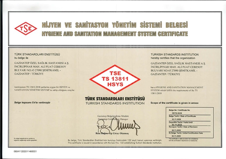 TS 13811 Hijyen ve Sanitasyon Yönetim Sistemleri Belgesi’ni almak, verdiğimiz hizmetin niteliğinin onaylanmış olması açısından büyük önem taşımaktadır. Ülkemizde bu konuda ilk ve tek hastane olmak bizim için ayrı bir gurur ve mutluluk kaynağı oldu.”
