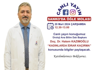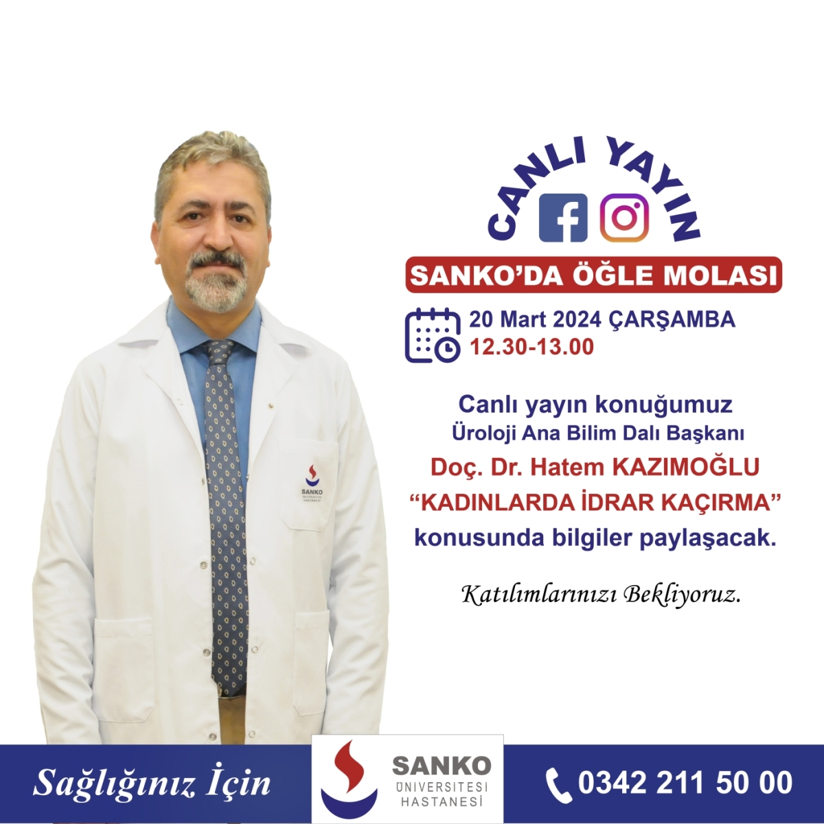 Canlı yayın konuğumuz Üroloji Ana Bilim Dalı'ndan Doç. Dr. Hatem KAZIMOĞLU “Kadınlarda İdrar Kaçırma” konusunda bilgiler paylaşacak.