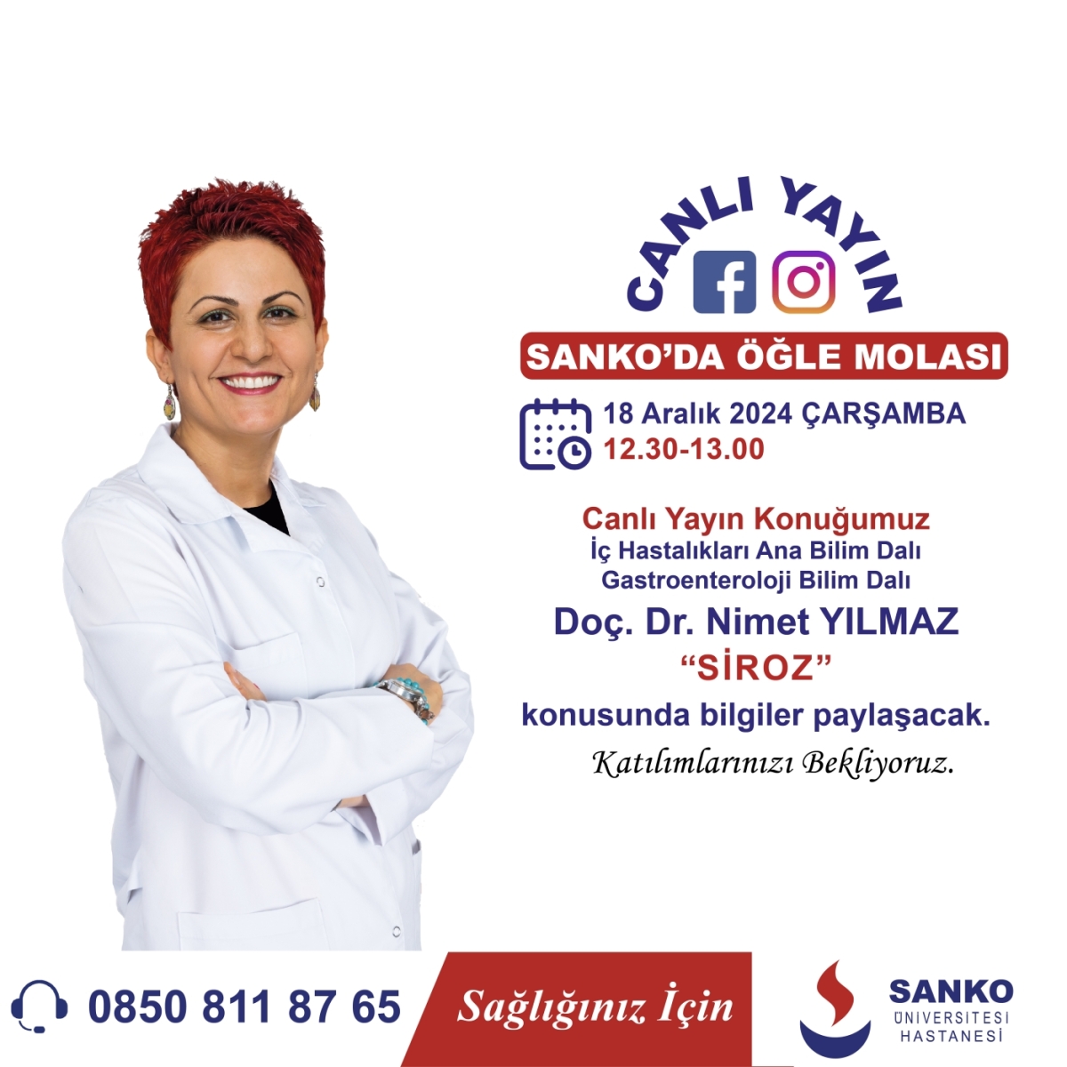 Canlı yayın konuğumuz SANKO Üniversitesi Tıp Fakültesi İç Hastalıkları Ana Bilim Dalı/Gastroenteroloji Bilim Dalı'ndan Doç. Dr. Nimet Yılmaz "Siroz" konusunda bilgiler paylaşacak.