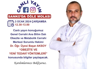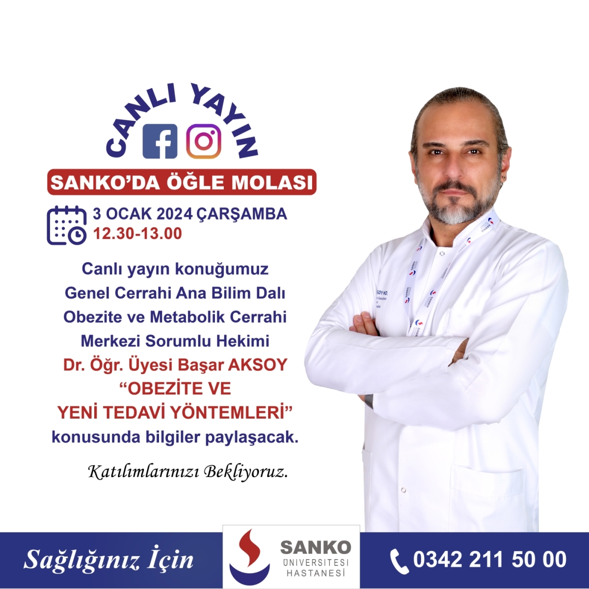 Canlı yayın konuğumuz Genel Cerrahi Ana Bilim Dalı\Obezite ve Metabolik Cerrahi Merkezi Sorumlu Hekimi Dr. Öğr. Üyesi Başar AKSOY “OBEZİTE VE YENİ TEDAVİ YÖNTEMLERİ” konusunda bilgiler paylaşacak.