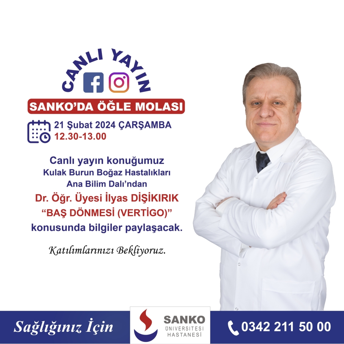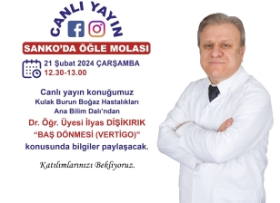 Canlı yayın konuğumuz Kulak Burun Boğaz Hastalıkları Ana Bilim Dalı’ndan Dr. Öğr. Üyesi İlyas DİŞİKIRIK “BAŞ DÖNMESİ (VERTİGO)” konusunda bilgiler paylaşacak.