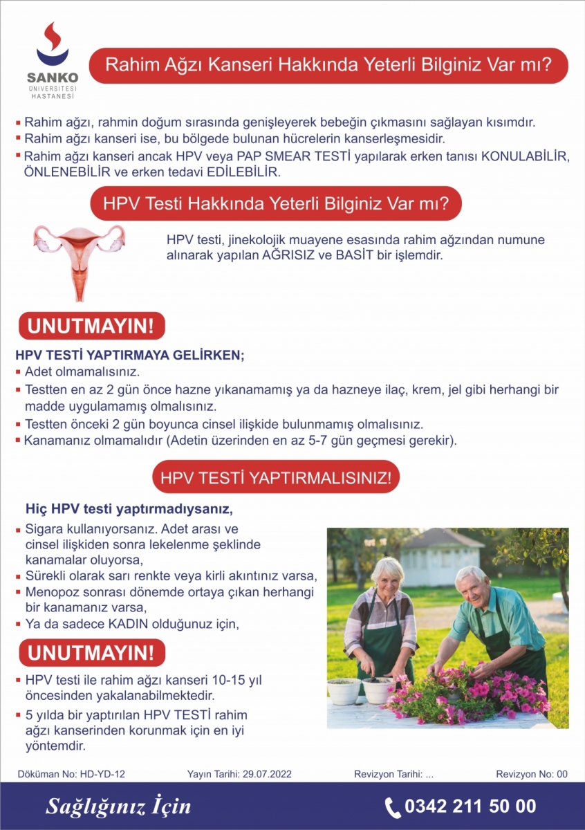 Türkiye Halk Sağlığı Kurumu tarafınca yürütülen Serviks Kanseri Tarama Programı’na destek olmak amacı ile Hastanemizde, Sağlık Müdürlüğü ile imzalanan protokol kapsamında ücretsiz olarak HPV testi yapılmaktadır.